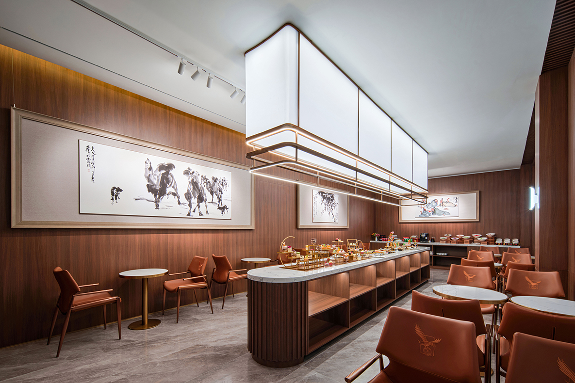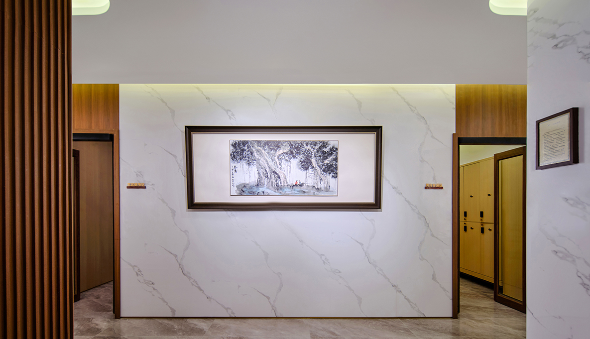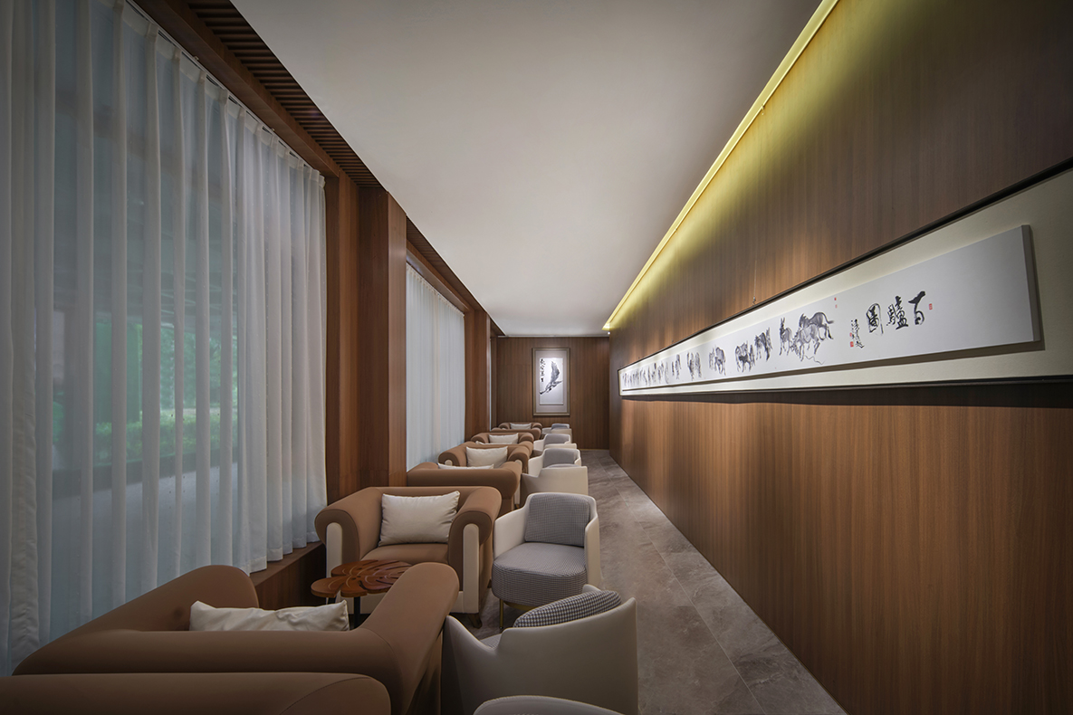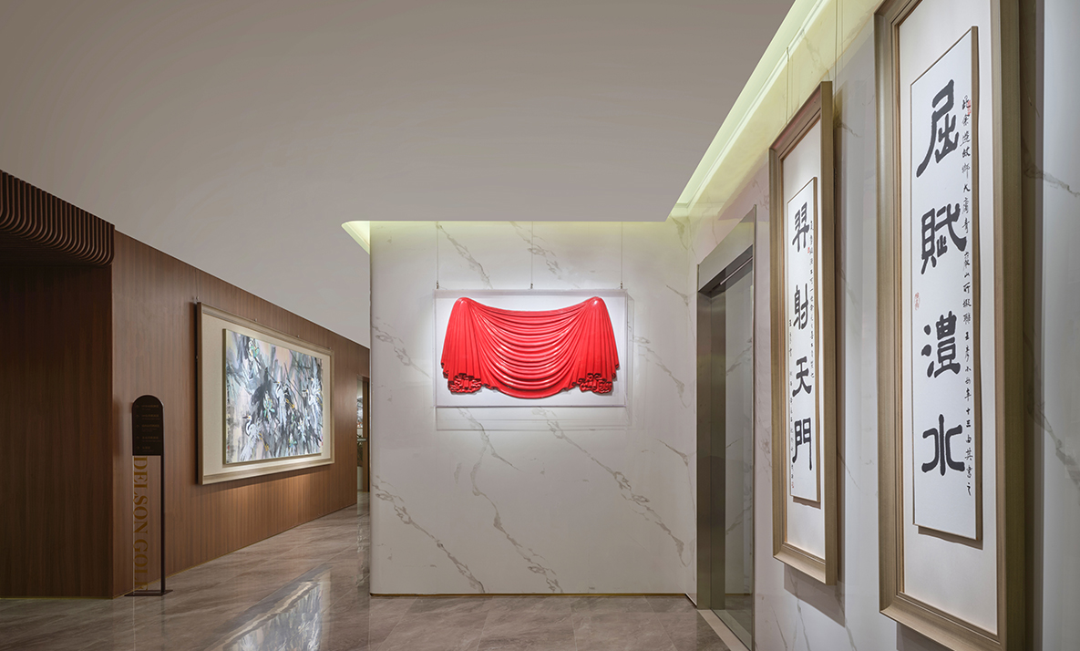 启新高尔夫会所通往桑拿区的走廊设有多件重要艺术作品,包括中央美术学院雕塑系张伟教授的雕塑《君王的外袍》,黄永玉先生具有代表性的水墨作品《暾将出兮东方》,以及当代艺术家蔡志松先生的雕塑精品。该空间融合雕塑与水墨,为宾客营造出一处静谧、富有格调的艺术走廊。The corridor leading to the sauna area at Delson Golf is adorned with several significant artworks, including The Robe of the King by Professor Zhang Wei from the Sculpture Department of the Central Academy of Fine Arts, the iconic ink painting The Sun Rises in the East by Huang Yongyu, and selected sculptural works by renowned contemporary artist Cai Zhizong. Blending the elegance of sculpture with the expressive charm of ink art, this refined passageway offers guests a serene and aesthetically elevated experience.