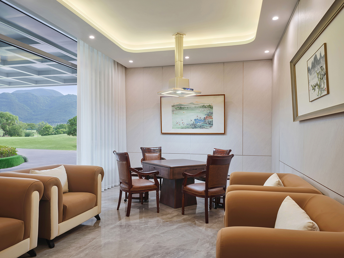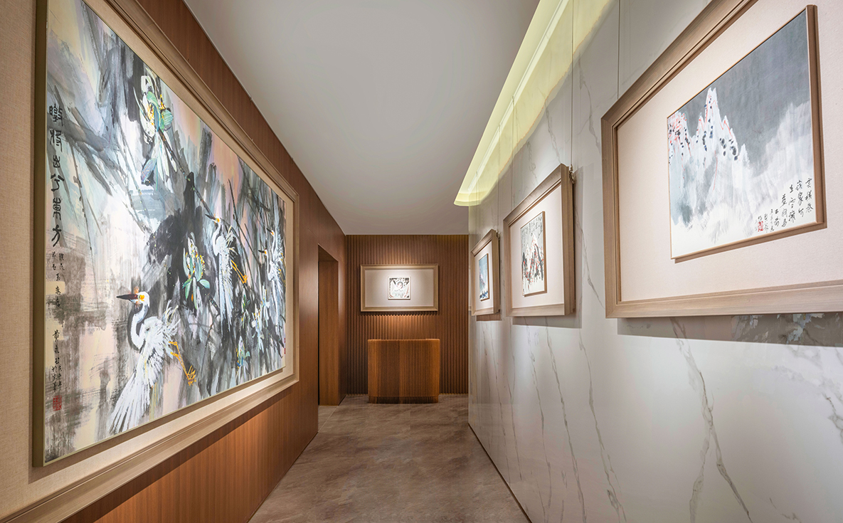 启新高尔夫桑拿麻将房融合休闲娱乐与艺术品位,空间内陈设有黄永玉先生、亚明先生、王铭董事长和多幅灵动的作品。VIP通道还挂有赖少奇先生的《石磊》、华君武先生的讽刺漫画原作以及范曾先生的代表性人物作品。画作风格或隽永清雅、或幽默犀利、或气韵生动,使空间在轻松氛围中亦不失文化深度,为宾客带来雅趣与思想的双重享受。Blending leisure with refined cultural sensibilities, the Sauna Mahjong Room at Delson Golf features original artworks by artists such as Huang Yongyu, Ya Ming, and Delson’s founder Wang Ming. In the adjoining VIP corridor, notable pieces include Stone Peaks by Lai Shaoqi, satirical ink works by Hua Junwu, and expressive figure paintings by Fan Zeng. The collection ranges from graceful and introspective to humorous and spirited, infusing the space with both artistic depth and relaxed charm—offering guests a moment of delight, reflection, and inspiration.