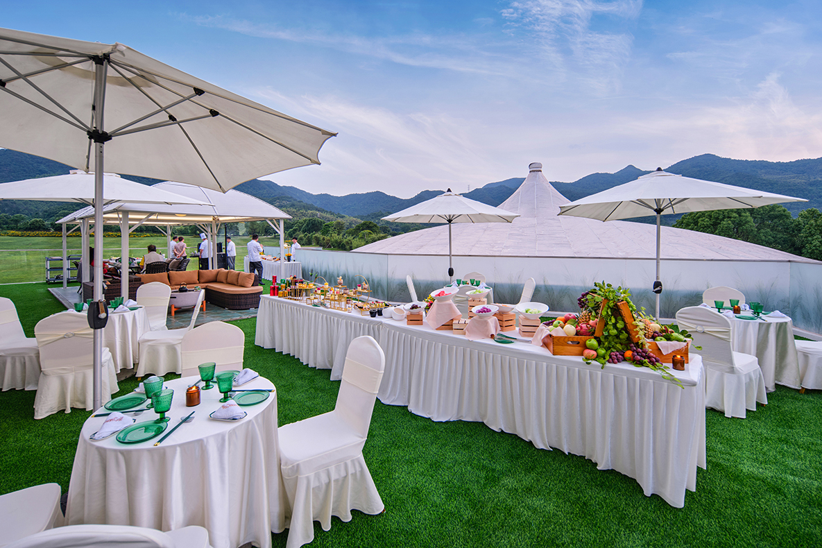 启新练习场为38000平面的大草坪,玫瑰厅外约面积2000 平方米特别开辟为户外婚礼而预备,视野通透,地势平整,三面环山一面向湖,兼具仪式感与自然美。该草坪可与玫瑰厅室内空间灵活组合,搭建专属舞台、拱门、宴会区与摄影区,适合举办千人草坪婚礼仪式、品牌发布会、高端庆典或大型茶歇活动,更可以容纳100桌以上的户外用餐。夜晚可配合灯光与LED投影营造梦幻氛围,是启新高尔夫最具代表性的室外婚礼场地之一。Located in front of the Rose Pavilion and adjacent to the driving range, this expansive 2,000 sqm lawn features unobstructed views and a gentle natural slope surrounded by hills and facing Dongqian Lake. It is ideal for large-scale lawn weddings, launch ceremonies, corporate banquets, or high-end outdoor receptions. When paired with the Rose Pavilion, it supports versatile layouts with staging, lighting, and LED effects, offering an unforgettable experience for up to 1,000 guests.