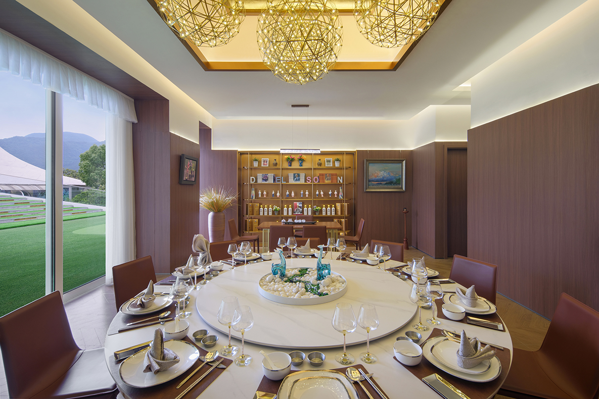 宁波厅为一间充满启新文化韵味的高端包厢,可容纳两桌宾客同时用餐,配置包括:一张主桌(约可容纳16人)。厅内配有独立休闲沙发区与独立卫生间,为宾客提供安静私密的用餐与会客环境。同时,包厢外设有高尔夫推杆体验区,可在餐叙之余,延伸运动之趣,提升整体体验感。The Ningbo Dining Room is a culturally enriched private suite reflecting Delson’s refined heritage. It accommodates two dining tables, including a primary table seating up to 16 guests. Inside, a dedicated lounge area and private restroom ensure comfort and privacy, while an outdoor putting space offers guests an added element of recreational charm—perfect for relaxed conversations and light golf activity.