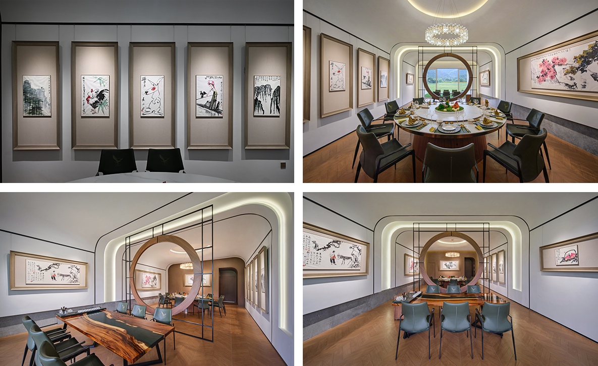 致敬王铭先生创办全国首家引入台资企业——深圳华侨家私有限公司,见证改革开放的创新时代。包厢为10-12人空间,设有开放式挥杆打位、茶桌与棋牌区,挂有黄永玉先生的《皆大欢喜》姚有多先生代表作,展现时代活力与文化包容。设计现代,宜商宜聚。Paying tribute to Mr. Wang Ming’s pioneering role in founding China’s first Taiwan-invested enterprise, this 8–10 person suite reflects the spirit of reform and innovation. With swing facilities and works by master Yao Youduo, the space balances modern style with cultural nuance, ideal for both business and leisure.