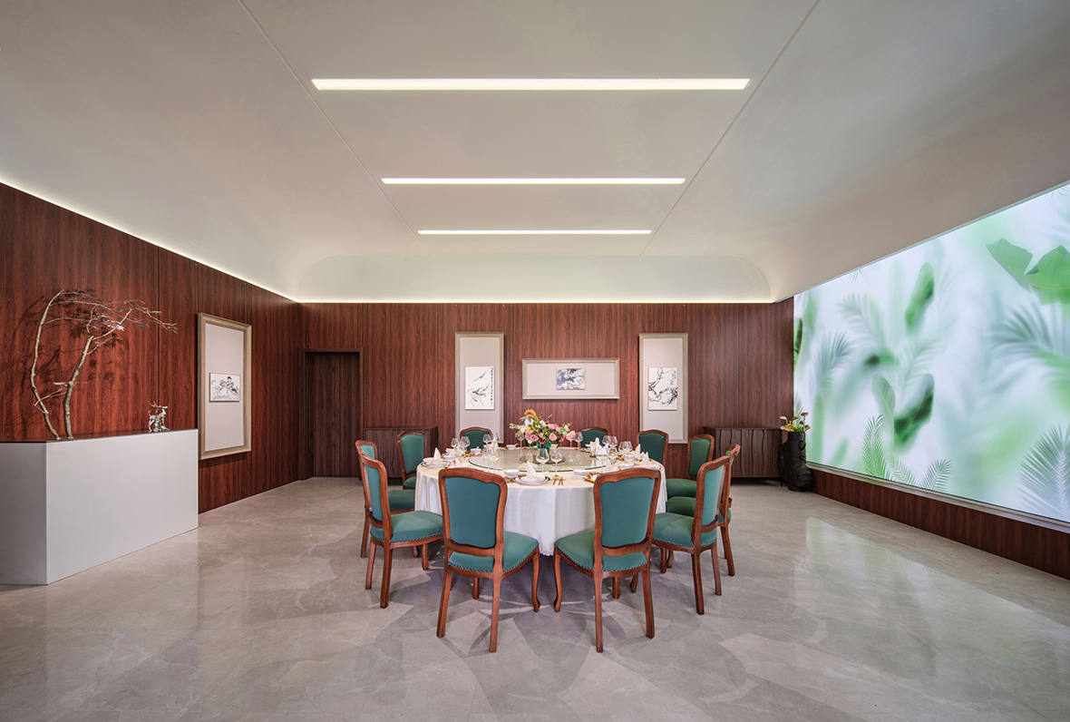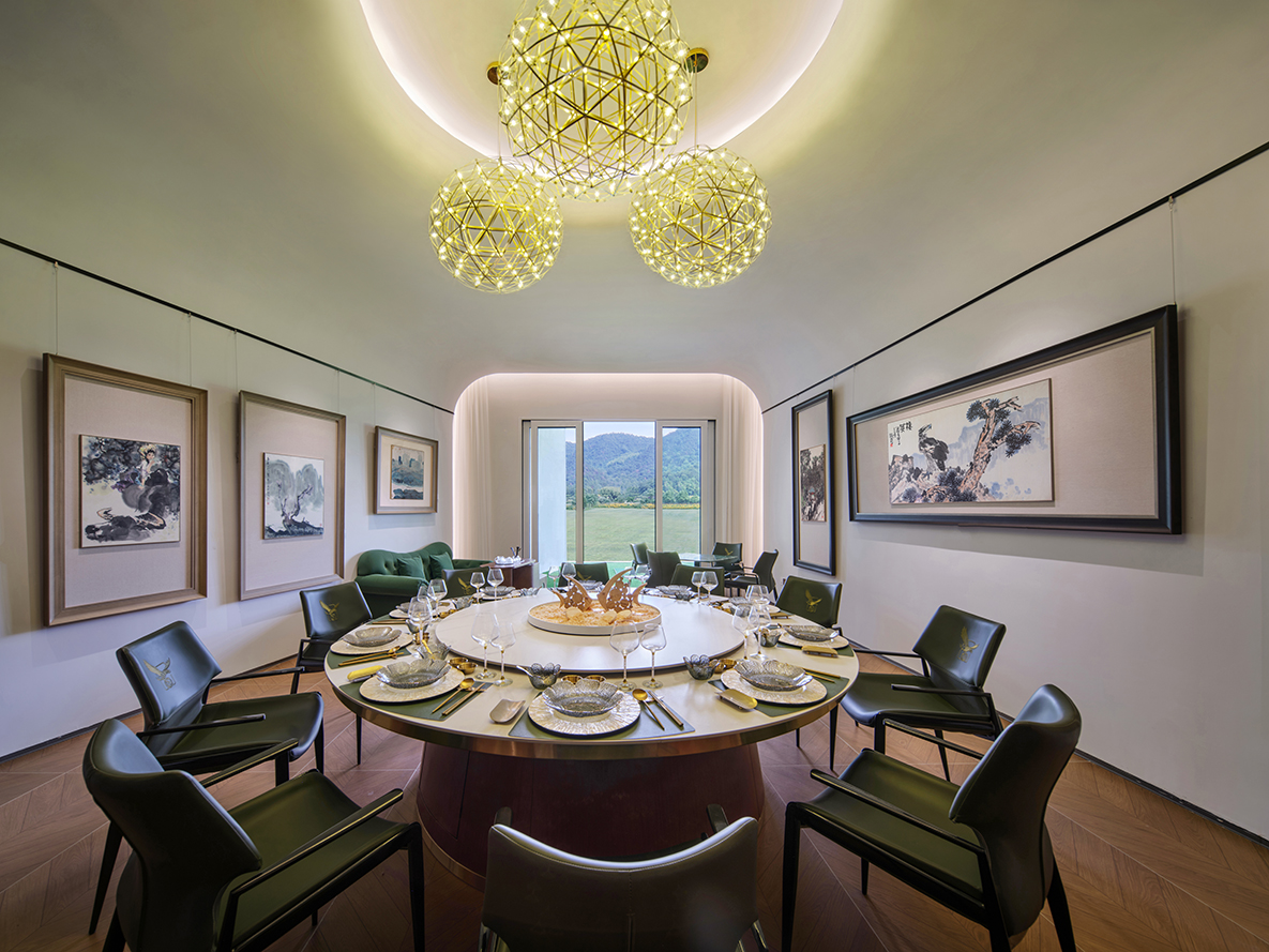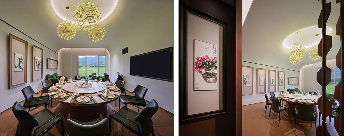 致敬王源兴先生在印尼巨港兴家创业、成为抗日支援先锋与华侨领袖的重要历程。包厢为10-12人空间,设有2个挥杆打位与大型茶桌,陈设黄永玉先生的《听雨》《红眼白兔》及邓林、何家英的合作水墨作品,沉稳内敛的风格使其成为私教培训或商务会谈的理想之所。This suite honors Mr. Wang Yuanxing’s entrepreneurial legacy and leadership in Palembang during wartime. Featuring 2 swing bays and a large tea table, it is adorned with ink paintings by Huang Yongyu and a collaborative work by Deng Lin and He Jiaying. The space offers a dignified ambiance suitable for both professional coaching and high-level dialogue.