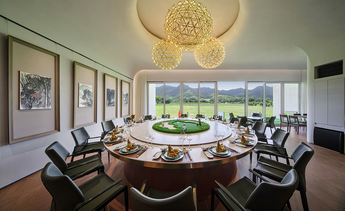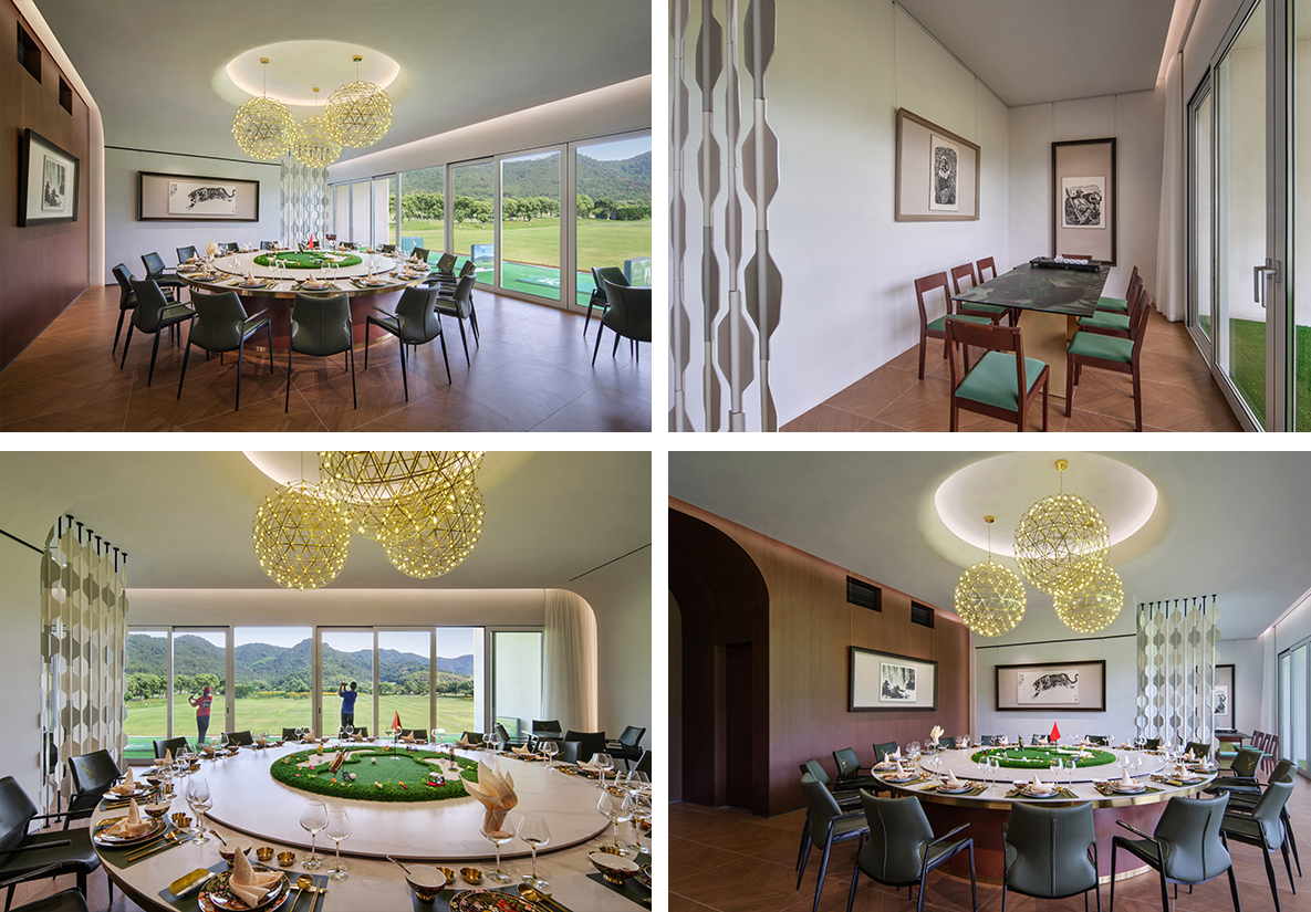 纪念王铭先生人生最后一次“雪中送炭”——在东钱湖建设启新球场,打造宁波绿色城市名片。包厢同样可容纳13–20人,设有开放式挥杆打位与茶室。空间陈设黄永玉《顿顿》、徐匡木刻等作品,整体艺术氛围深沉静谧,是体验高尔夫与地方文化融合的理想场所。This room commemorates Mr. Wang Ming’s final philanthropic endeavor: founding Delson Golf at Dongqian Lake. The 13–20 person suite includes swing bays and a dedicated tea space. With works by Huang Yongyu and woodcut master Xu Kuang, it offers an atmosphere of introspection—blending sport with regional cultural heritage.